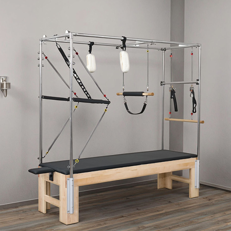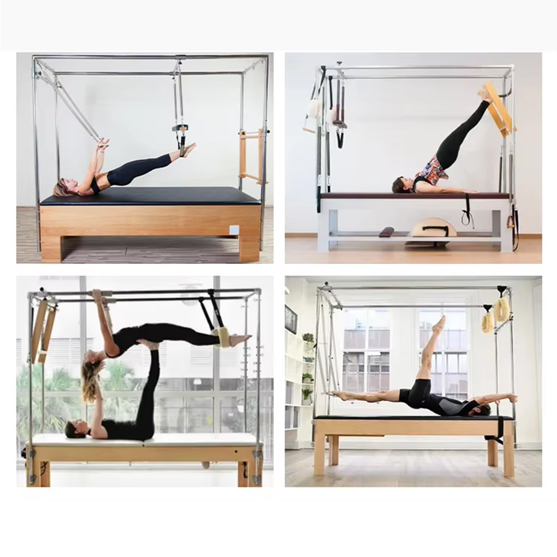 The Pilates Cadillac Bed is one of the core pieces of large Pilates equipment.It features a premium maple wood main frame paired with stainless-steel components, and the bed surface is covered with comfortable and durable padded leather. Its elevated trapeze-style structure includes a full set of accessories such as springs, handles, foot straps, and wooden bars, allowing adjustments to training intensity and angles.The Cadillac enables comprehensive full-body muscle training and helps improve posture. It is suitable for professional studio private sessions as well as home fitness. By enhancing core strength, flexibility, and coordination, it serves as a highly professional and practical tool for Pilates practitioners.
