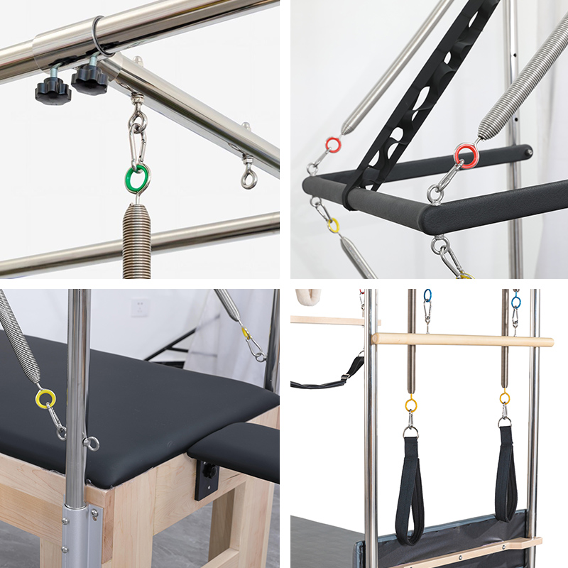 The machine enables full-body muscle training. With various accessories—springs, straps, handles, foot loops, and wooden bars—it can target the core, upper body, lower body, as well as flexibility and coordination. For example, handles combined with springs are used for arm strengthening and stretching, while foot straps and pulleys help train leg muscles.